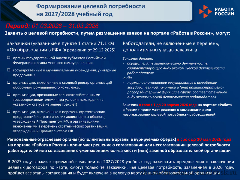 - На портале «Работа в России» начался приём заявок на кадровую потребность для получения квоты на целевое обучение на 2027/2028 учебный год.