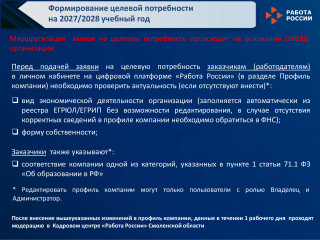 - Работодатели, не включённые в этот перечень, указывают потенциального заказчика. Он согласовывает целевую потребность на платформе «Работа в России» с 1 по 20 апреля 2026 года. Заказчик должен осуществлять деятельность, соответствующую виду экономической деятельности работодателя, либо выполнять функции нормативно-правового регулирования и выработки государственной политики в этой сфере.