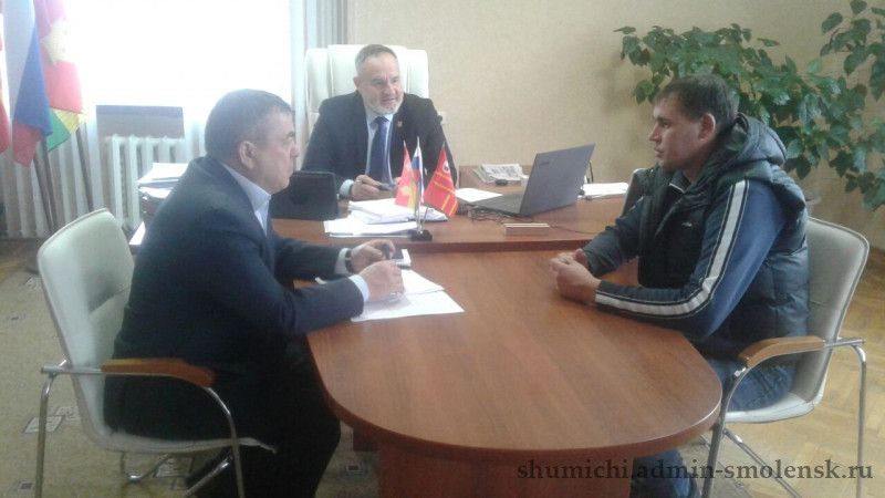 Глава Шумячского муниципального округа Д.А. Каменев совместно со своим заместителем В.Е. Абраменковым провел рабочую встречу с председателем СПК "Искра" Антоном Матейко.