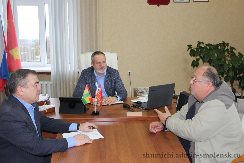 Сегодня, 28 ноября, состоялась рабочая встреча Главы муниципального образования "Шумячского муниципального округа" Смоленской области Д.А. Каменева и его заместителя Василия Евгеньевича Абраменкова с индивидуальным предпринимателем Главой КФХ Кебурия Тенгизом Давидовичем. В начале встречи Глава округа тепло поприветствовал гостя-постоянного участника сельскохозяйственных ярмарок, проводимых на территории Смоленской области. Тенгиз Давидович многократно отмечен и органами местного самоуправления, и органами государственной власти за деятельное участие в мероприятиях с\х направленности. Основная часть беседы была посвящена обсуждению текущих результатов хозяйственной деятельности за прошедший период 2025 года и планам на очередной год. Тенгиз Давидович посетовал на недостаточность земельных угодьев для развития производства около своей базы в д. Гневково. По итогам разговора было принято решение поручить заместителю главы администрации подготовить предложение относительно возможности предоставления дополнительных участков земли близ указанного населённого пункта.