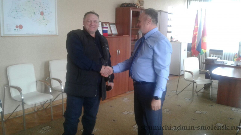 Принимая во внимание значимость работы по развитию малого бизнеса в рамках программы "Первый старт" Глава Шумячского муниципального округа Д.А. Каменев встретился с индивидуальным предпринимателем В.А. Карезо, который прошел обучение в центре "Мой бизнес" и является претендентом на получение гранта.