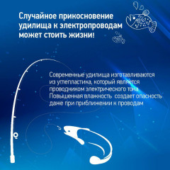 • Выбирайте безопасное удилище. Удилища из углепластика проводят электрический ток. Повышенная влажность, мокрая леска создают смертельную опасность даже при отсутствии касания проводов – достаточно приблизиться к ним на недопустимое расстояние. Телескопическое удилище требует большого пространства для взмаха.
