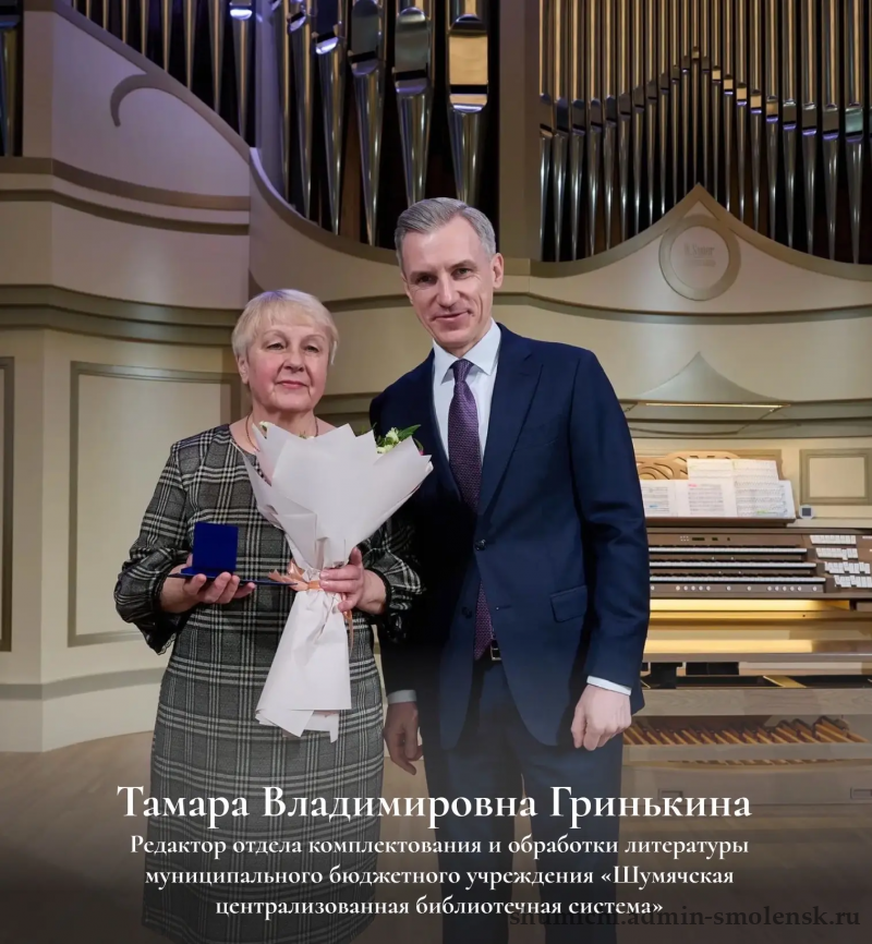Одной из награжденных стала Тамара Владимировна Гринькина, редактор отдела комплектования и обработки литературы Шумячской централизованной библиотечной системы. Она была отмечена за многолетний добросовестный труд в сфере культуры и искусства, вклад в возрождение и сохранение культурных традиций Смоленщины.