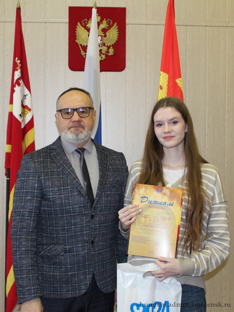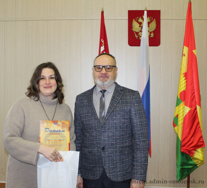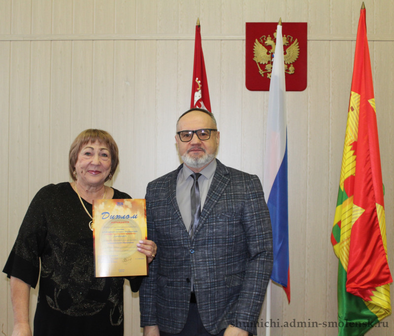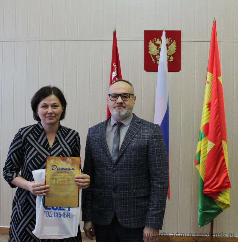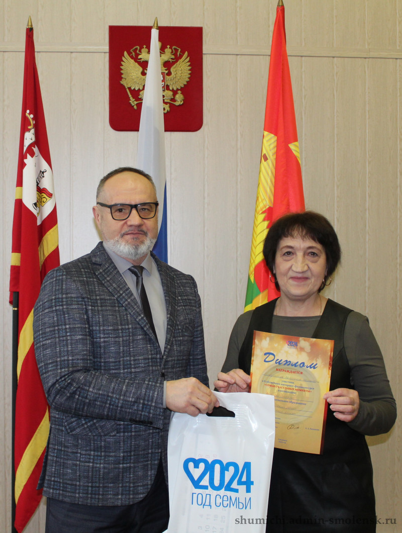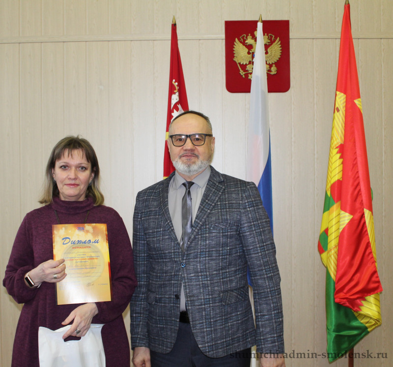 Дмитрий Анатольевич Каменев, глава муниципального образования «Шумячский муниципальный округ» Смоленской области и Ирина Григорьевна Кулешова, начальник Шумячского Отдела по образованию, вручили дипломы, подарочные сертификаты на сумму 500 рублей и календари 14 участникам конкурса: Астапенковой Валентине Васильевне, Буденковой Виктории Геннадьевне, Михайловой Валентине Викторовне, Тращенковой Ирине Ивановне, воспитателям детского сада «Солнышко»; Петрушиной Любовь Николаевне, заведующей детского сада «Родничок»; Хиондерко Татьяне Николаевне, учителю Руссковской средней школы; Василик Евгении и Малышкиной Дарье, обучающимся, Троенько Валентине Владимировне, методисту Шумячского ДДТ; Козлову Антону Васильевичу, читателю Первомайский сельской библиотеки; Куприной Виктории, читателю Гневковской сельской библиотеки; Козинниковой Ольге, Якубенко Алёне, читателям Шумячской центральной библиотеки.
